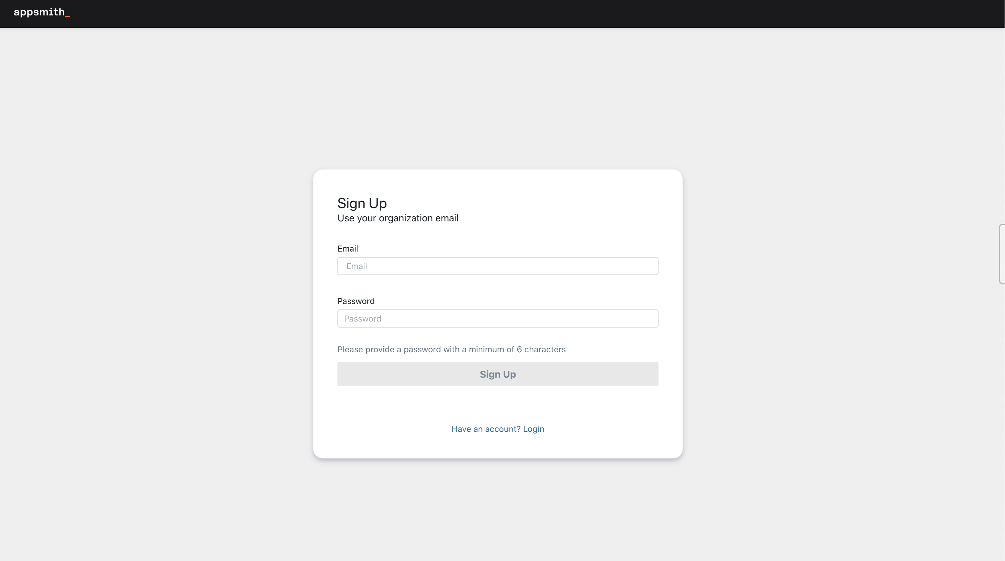 • Go to the Sign Up page, fill in your user's email & password, then click Sign Up Appsmith Signup Page