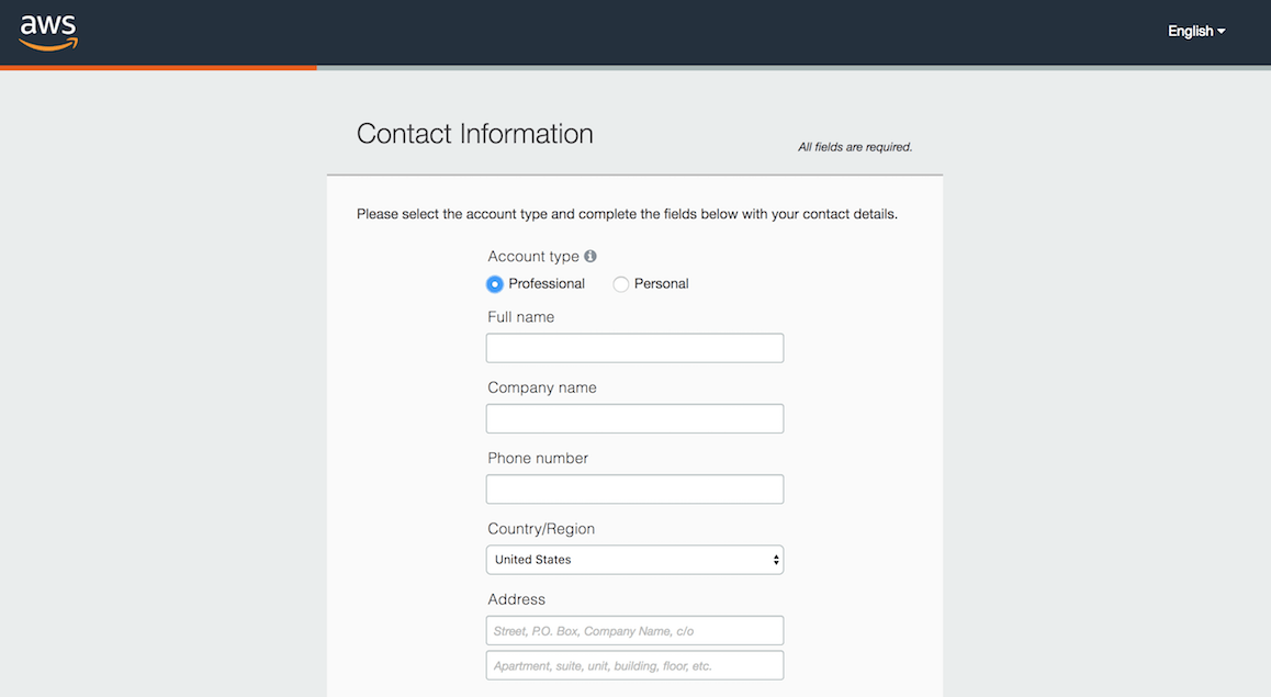 • Once youve signed in to Amazon, sign up for AWS by selecting the account type and providing some basic contact information and your mobile phone number. Aws Register Page