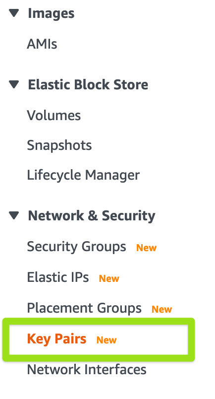 • From the Amazon EC2 dashboard, select the “Key Pairs” option in the “Network & Security” menu. Key pairs