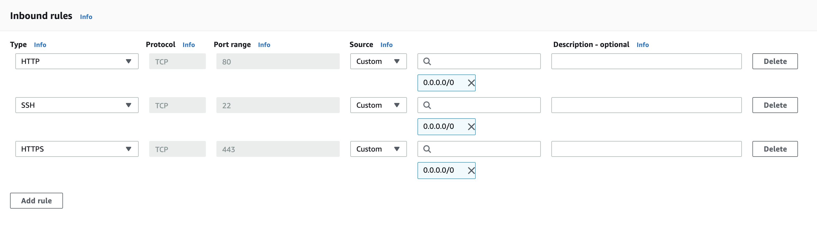 • Click the “Add Rule” button in "Inbound Rule" section and add new rules for HTTP, HTTPS and SSH access using the following guidelines:
