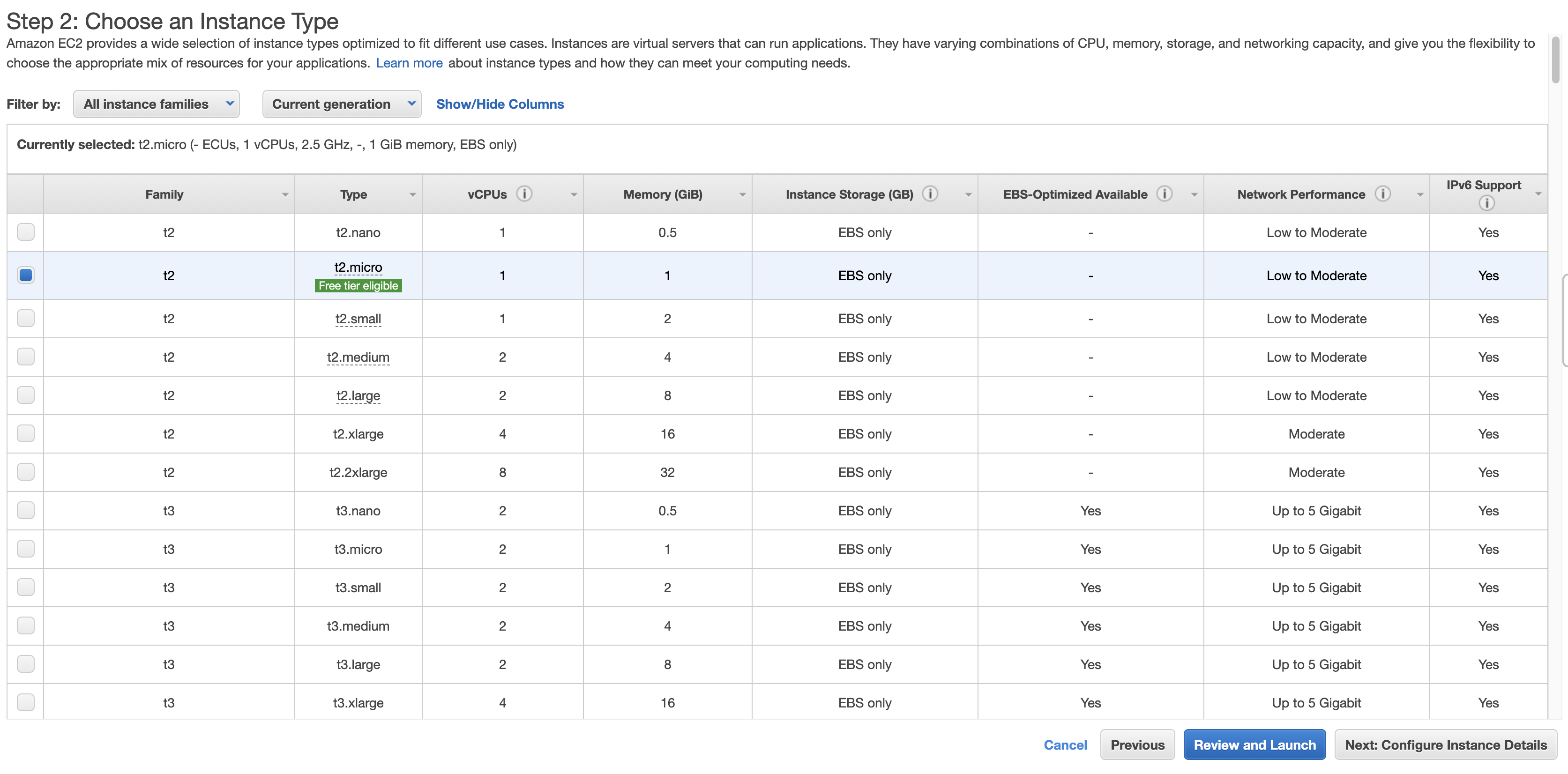 • On the resulting detail page, review the available server sizes. Select the server size you wish to use and click “Review and Launch” to proceed. Instance Preview